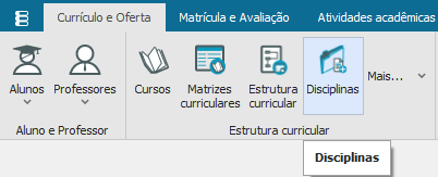 O cadastro de “Disciplinas” está localizado no “Módulo Educacional” aba “Currículo e Oferta”