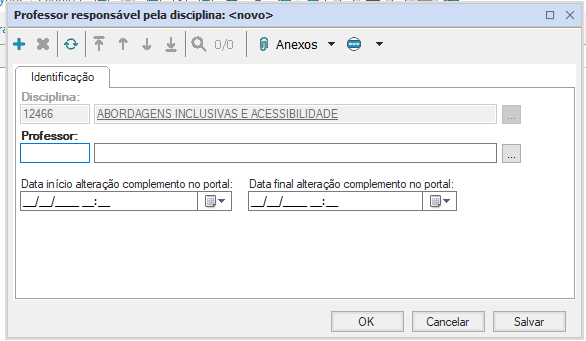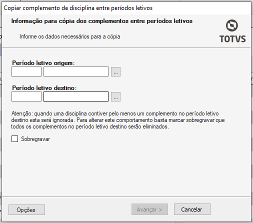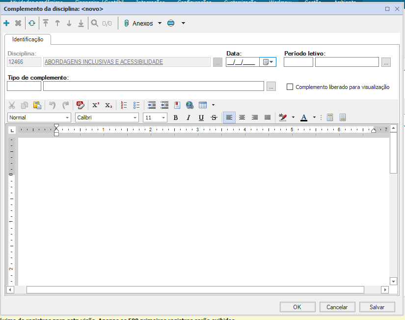 Período Letivo: campo utilizado para definir o período letivo que será vigorado o complemento da disciplina;