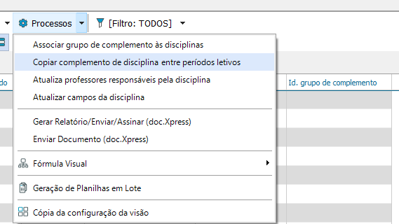 Em “Processos” tem a possibilidade de copiar os complementos da disciplinas entre Períodos Letivos. Para isso, selecione a opção “Processos- Copiar Complemento da disciplina entre Períodos Letivos”