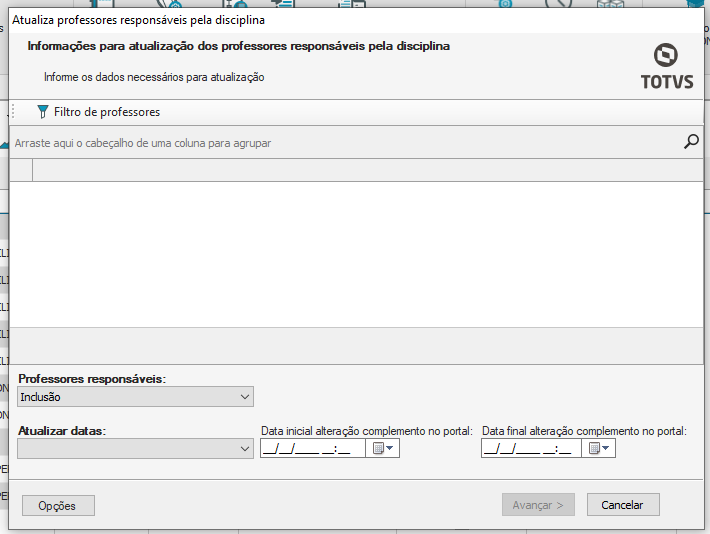 Ainda na opção Processos, existe a possibilidade de atualizar os professores das disciplinas, de maneira geral. Para isso , selecione a opção “Processos- Atualiza professores responsáveis pela disciplina”