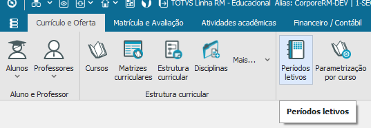 O cadastro de Período Letivo fica localizado, no “Módulo Educacional” aba “Currículo e Oferta” opção “Períodos Letivos”