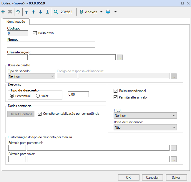 -Campo marcado, indica que o valor ou o percentual definido para o desconto poderá ser manipulado pelo usuário no momento da utilização da bolsa dentro do próprio contrato do aluno ou diretamente nos processos que atribuem bolsas aos alunos.