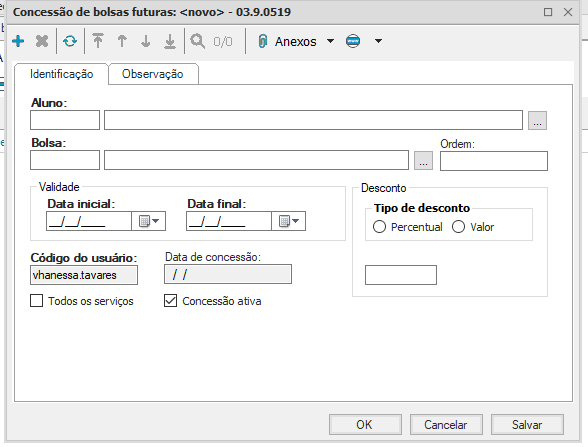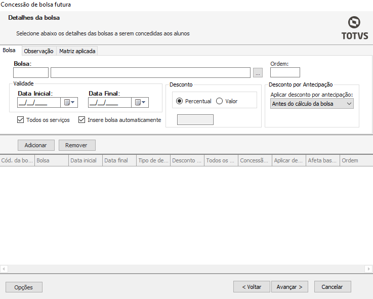 Validade: Faça a sua aplicação através dos campos “data inicial” e a “data final”. Assim, se a data de vencimento das parcelas estiver entre a data de validade, a bolsa será concedida para tais parcelas;