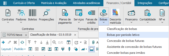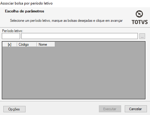 A opção “Bolsa por Período Letivo” é utilizada para determinar as bolsas que serão utilizadas no período letivo subsequente