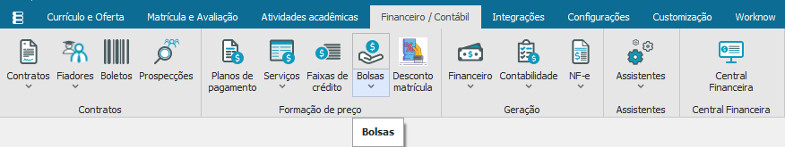 O cadastro de bolsas está localizado no “Módulo Educacional- Educacional” aba “Financeiro/ Contábil” opção “Bolsas”