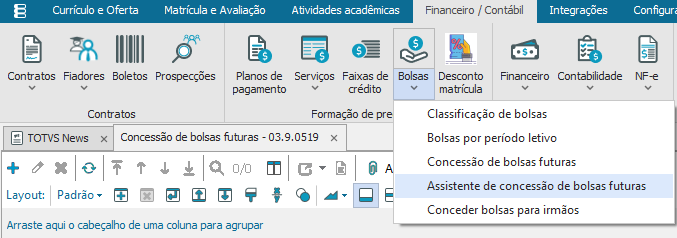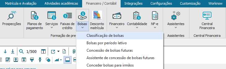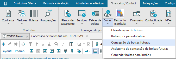 Esse processo permite a instituição de ensino fazer o planejamento das bolsas que serão disponibilizadas a determinados alunos de maneira a atender possíveis campanhas de matrícula ou regras próprias de negócio. Para realizar esse processo, escolha a opção “Bolsas- Concessão de Bolsas Futuras”