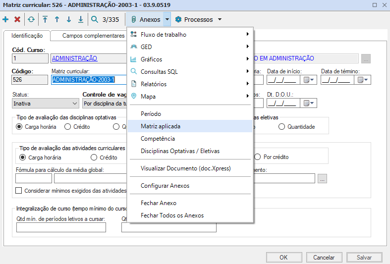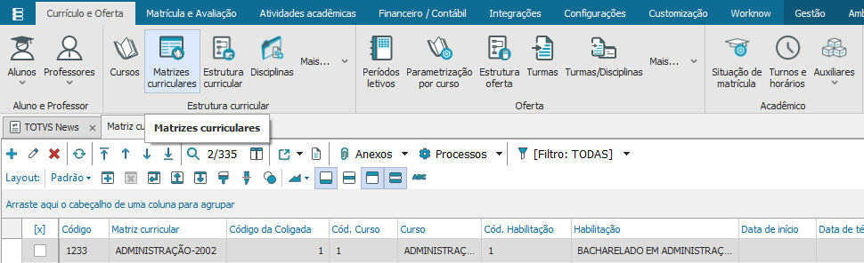 Esse processo consiste em vincular os descontos por antecipação nas matrizes curriculares, os alunos vinculados à determinada matriz terá seu desconto correspondente. Para executar esse processo, selecione a aba “Currículo e Oferta” opção “Matrizes Curriculares” e escolha a matriz que será vinculada ao desconto por antecipação