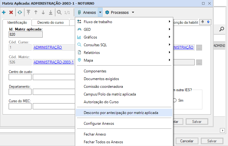 Para abrir a nova aba dentro da matriz aplicada siga em; Anexos – Desconto por antecipação por matriz aplicada