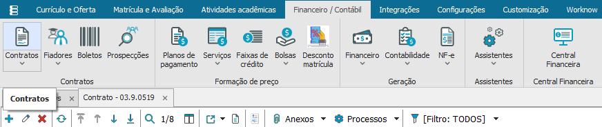 Para realizar a vinculação, acesse a aba de “Financeiro/ Contábil” – Contratos