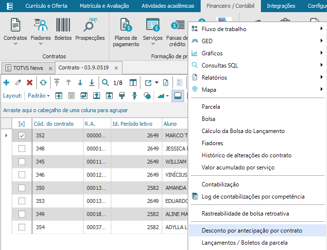 Selecione o contrato no qual deseja vincular o desconto e em seguida, escolha a opção” Anexos – Desconto por antecipação por contrato”
