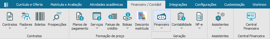 Os processo realizado a seguir se encontra dentro do “Módulo Educacional” – Aba “Financeiro / Contábil” – opção “Geração”