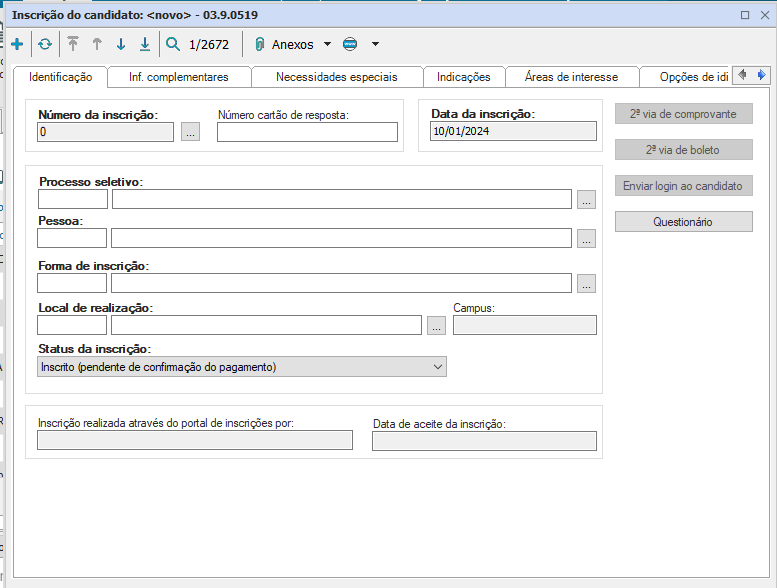 A aba de identificação é onde são adicionadas as informações do candidato ao processo seletivo em questão, como o número de inscrição, campo gerado automaticamente pelo sistema; processo seletivo, campo selecionável onde é informado o processo seletivo que será direcionado a inscrição; pessoa, campo onde é informado o nome do candidato inscrito; forma de inscrição, forma escolhida pelo candidato para a realização do processo seletivo; local de realização da prova, cidade escolhida pelo candidato para realização das provas e o status de inscrição, que pode ser : inscrito (pendende de confirmação de pagamento), candidato (inscrição confirmada), inscrição cancelada.