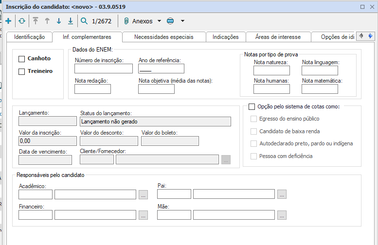Nesta guia deverão ser configurados detalhes secundários relacionados à inscrição.