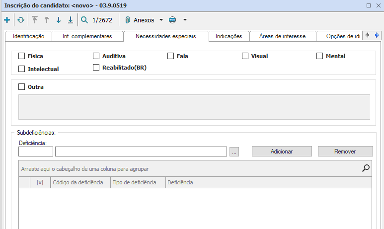 Quando houver alguma deficiência informada, ela será considerada pelo processo “Alocar Candidatos em Locais de Prova”. Os candidatos portadores de deficiência serão alocados em salas com suporte a estas necessidades informadas. Quando selecionada o campo “Outra” para necessidades especiais o candidato nunca será alocado pelo processo de alocação automática, sendo sempre necessária a sua alocação manual por meio do serviço “Local da Prova do Candidato”.