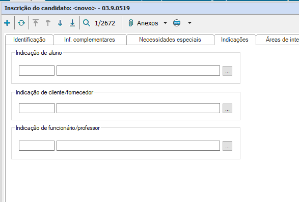 Se a forma de inscrição escolhida permitir indicações, será possível informar uma pessoa ligada à instituição que tenha indicado o processo seletivo para o candidato. Essa informação poderá ser utilizada para restringir a concessão de determinados descontos a candidatos ou para contabilizar indicações caso se queira premiar indivíduos (alunos, professores, funcionários, etc.) com maiores números de indicações para o processo seletivo.