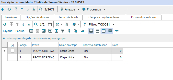 2ª via de comprovante: Permite imprimir o comprovante de inscrição através de relatório criado no gerador de relatórios.