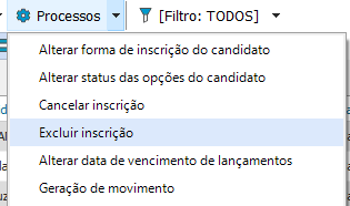 Selecione o(s) candidato(s) e em seguida escolha a opção “Processos- Excluir Inscrição”