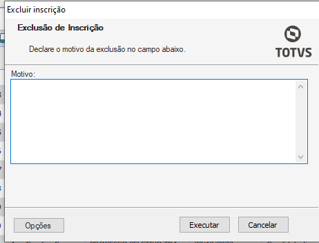 Declare o que motivou a exclusão e em seguida, clique em “executar”