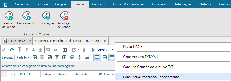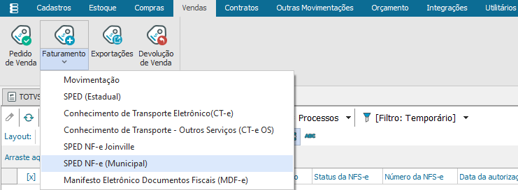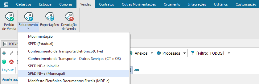Processo que continuação do envio de NF-e, no qual se pode visualizar o encaminhamento do processo, como por exemplo se foi autorizado ou cancelado. Para realizar essa ação, escolha “Faturamento – SPED NF-e (Municipal)”