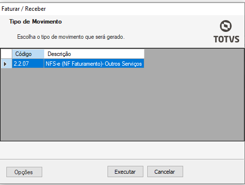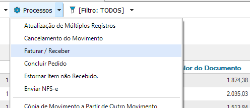 Para realizar o processo de faturamento, selecione os movimentos desejados e em seguida, clique em “Processos- Faturar/ Receber”