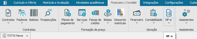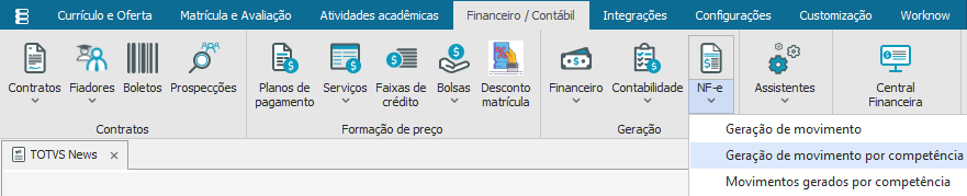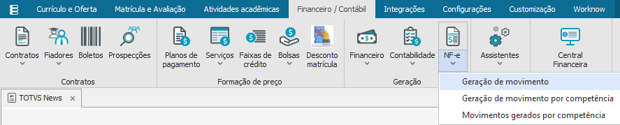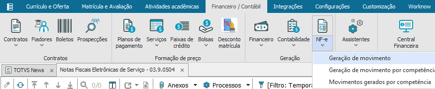 Este processo permite gerar movimentos para a futura emissão da NF-e referente aos serviços prestados pela Instituição, podendo escolher entre as duas maneiras de geração disponibilizadas pelo sistema como: