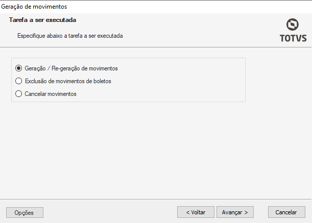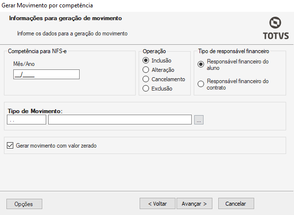 Tipo de Movimento: Selecione o tipo de movimento para a geração;