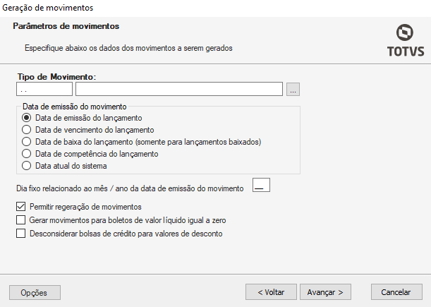 Data de emissão do movimento: Selecione a opção de acordo com o desejado;