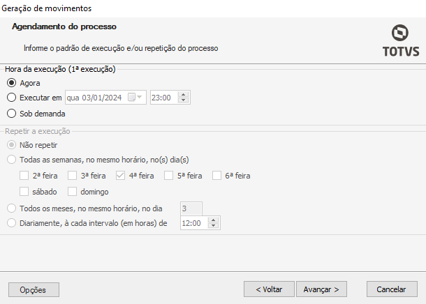 – Agora: Sendo selecionado este a execução acontecerá assim que você finalizar esse processo.