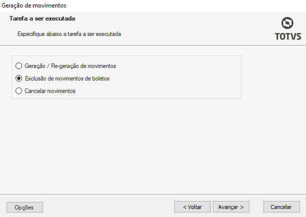 Para iniciarmos o processo, selecione a opção “Exclusão de movimentos de Boletos”