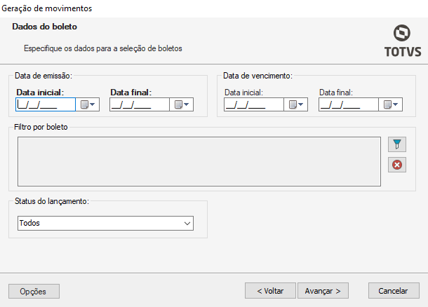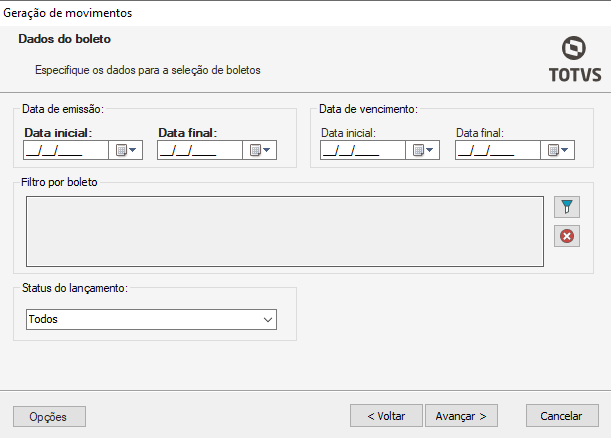 Nesta aba deve ser especificado os dados para a seleção dos boletos. Preencha os campos conforme as orientações