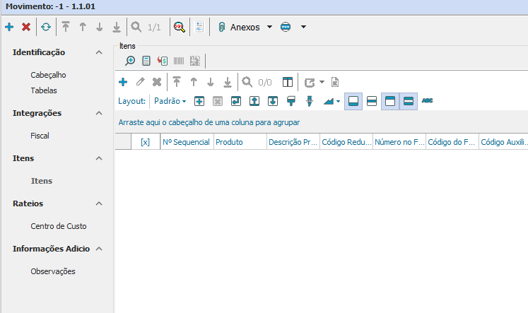 Aba onde deverá ser preenchida com os itens referente a requisição que está sendo criada. Para realizar a inclusão dos itens, clique em “Incluir” e preencha as informações sobre o item do movimento