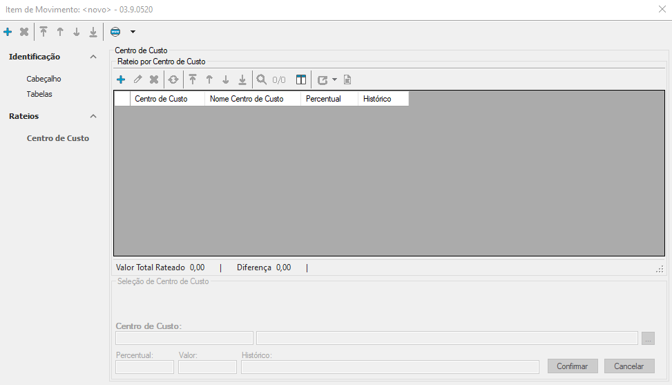 Aba onde deverá ser informado sobre o rateio por centro de custo do item que está sendo selecionado