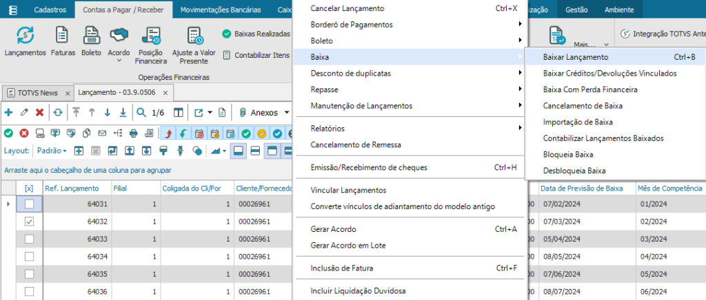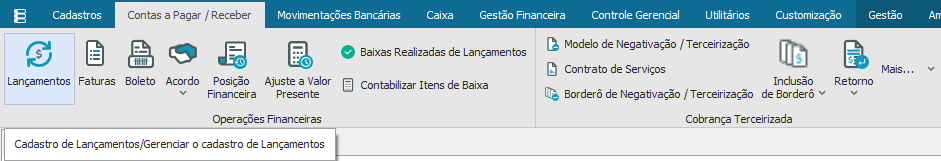 O processo de baixa está localizado no “Módulo BackOffice – Gestão Financeira” aba “Contas a pagar/ Receber” opção “Lançamentos”