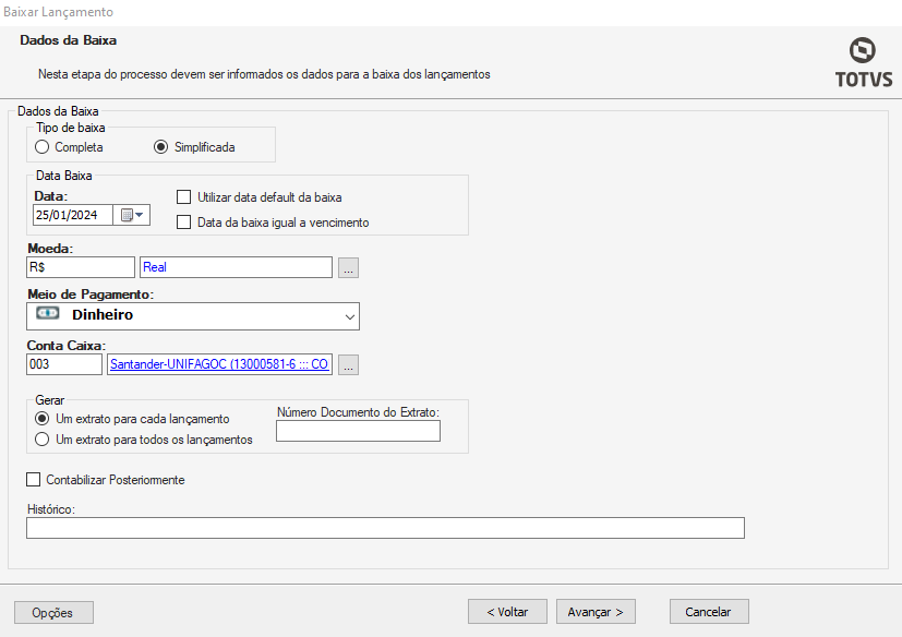No sistema temos duas maneiras de realizar a baixa do lançamento, a baixa simplificada e a completa: