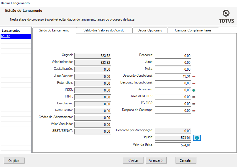 Nessa aba é possível informar e editar os dados do lançamento antes da baixa