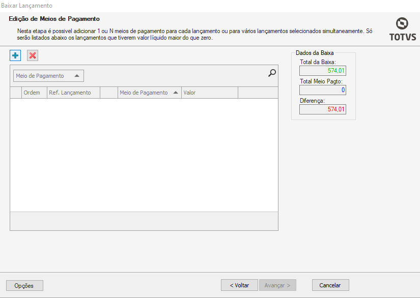 Meio de Pagamento: informe o meio de pagamento dessa baixa;