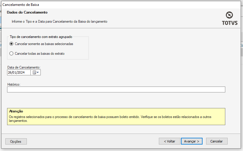 -Cancelar todas as baixas do extrato: ao marcar essa opção serão canceladas todas as baixas selecionadas no extrato;