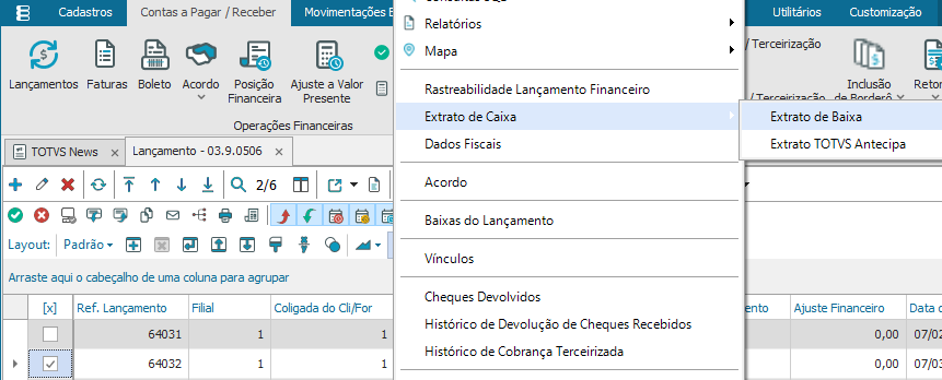 Para dar a conferência do extrato da baixa prossiga dentro da opções de lançamento, selecione aquele que deseja conferir, após isso clique “Anexos – Extrato de Caixa – Extrato de Baixa”