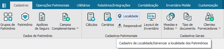 O cadastro das localidades tem o objetivo de informar a localização dos bens patrimoniais e está localizado no “Módulo BackOffice- Gestão Patrimonial” aba “Cadastros” opção “Localidade”