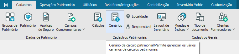 O cadastro de cenários está localizado no “Módulo BackOffice- Gestão Patrimonial” aba “Cadastros” opção “Cenários”