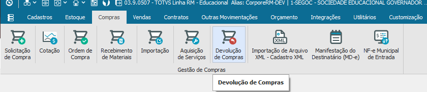 O processo de devolução de compras está localizado no “Módulo BackOffice- Gestão de Estoque, Compras e Faturamento” aba “Compras” opção “Devolução de Compras”