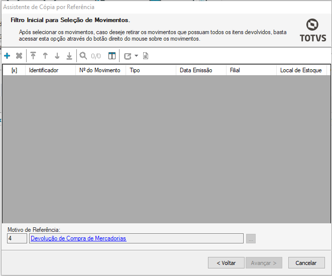Logo após escolher o movimento, clique em “avançar” e selecione o item que deve ser devolvido
