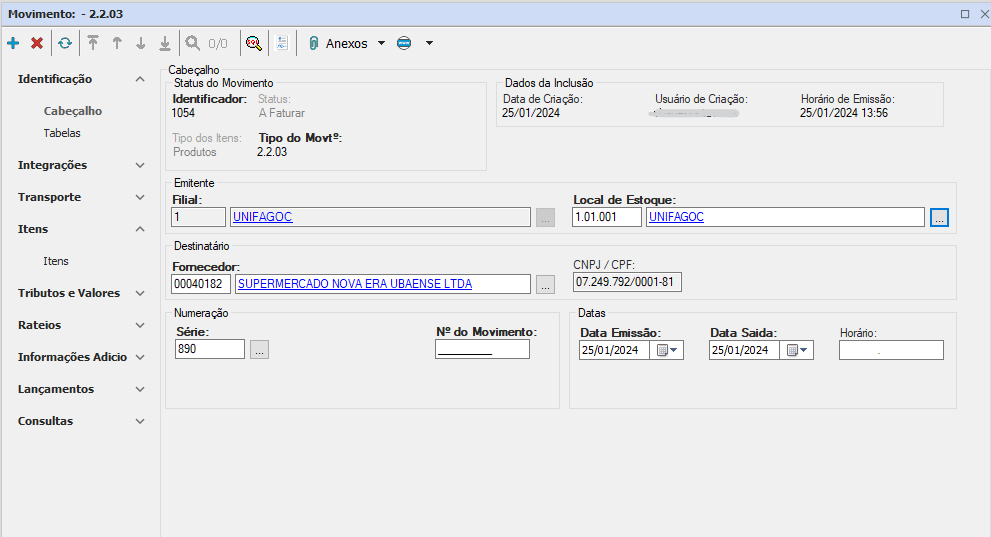Após realizar a escolha do item, clique em “Executar” e informe o “Nº do Movimento” (número da NF) na tela que vai abrir