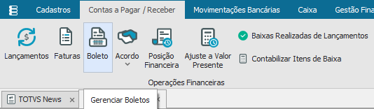O processo a seguir está localizado no “Módulo BackOffice- Gestão Financeira” aba “Contas a pagar/ Receber” opção “Boleto”