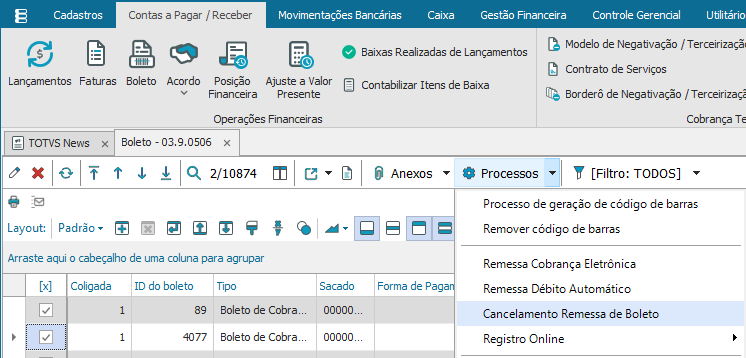 Para realizar o processo de cancelamento da remessa é necessário selecionar o boleto que deseja cancelar e em seguida, escolha a opção “Processos- Cancelamento de Remessa de Boleto”