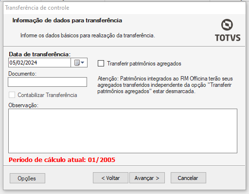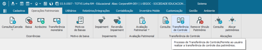 O processo apresentado a seguir, está localizado no “Módulo BackOffice- Gestão Patrimonial” aba “Operações Patrimoniais” opção “Transferência de Controle”