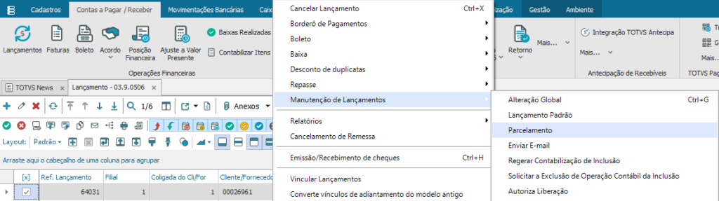 Para realizar um parcelamento, selecione o lançamento desejado e em seguida escolha a opção “Processos- Manutenção de Lançamentos- Parcelamento”