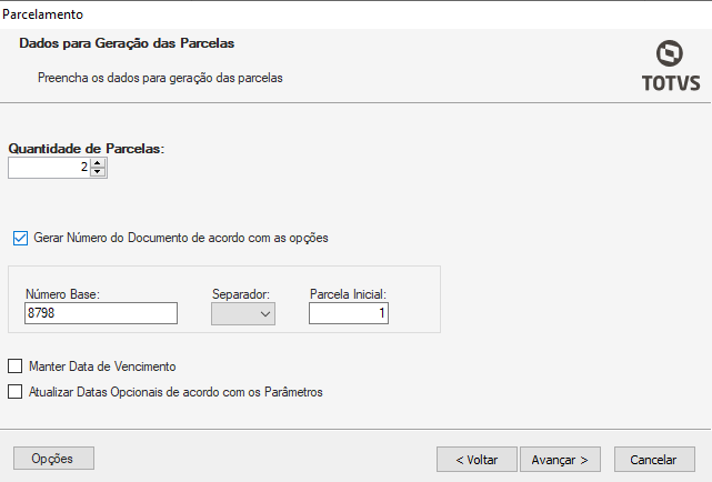 Quantidade de Parcelas: informe a quantidade de parcelas que será gerada;