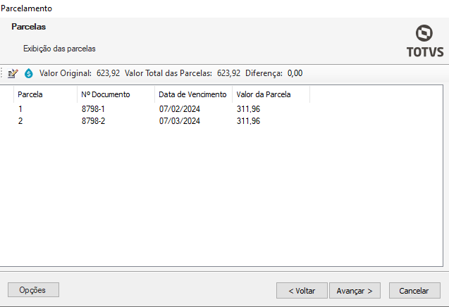 Avançando é possível ver a visualização das parcelas, junto a data de vencimento e o valor de cada uma