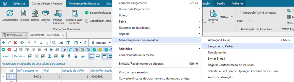 Esse processo também é um outro meio de parcelar o lançamento, para realiza-lo dentro da opção de “Lançamentos” selecione aquele que deseja parcelar e clique em “Processos – Manutenção de Lançamentos- Lançamento Padrão”
